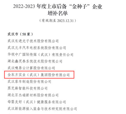 金东方获评2022-2023年度湖北省上市后备“金种子”企业榜单