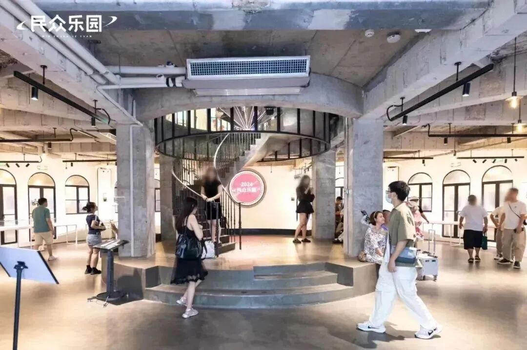 今年6月28日,民众乐园先行开放了中庭和圆堡塔楼部分。中庭面积近千平米,被命名为“民众剧场”,打造沉浸式的剧场空间。每月,这里都会举办各种音乐演出、电音派对,未来还将和各品牌合作演出。标志性的圆堡塔楼秉持着“修旧如故”原则,将整个塔楼的楼板打通,把空间释放出来,精巧展现时间赋予的痕迹美学。